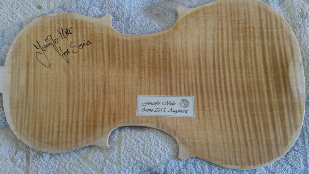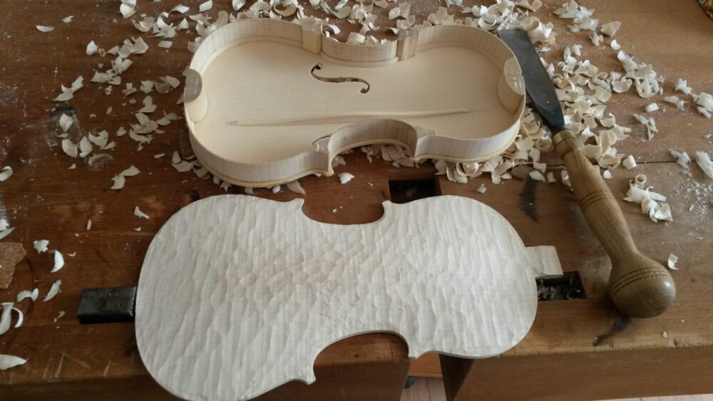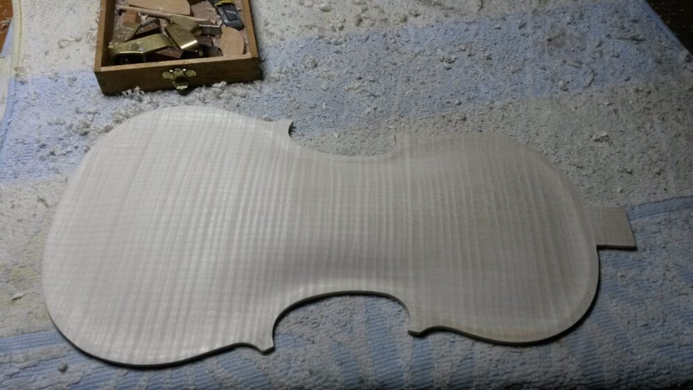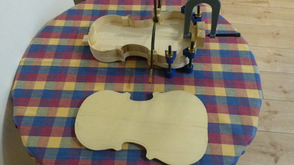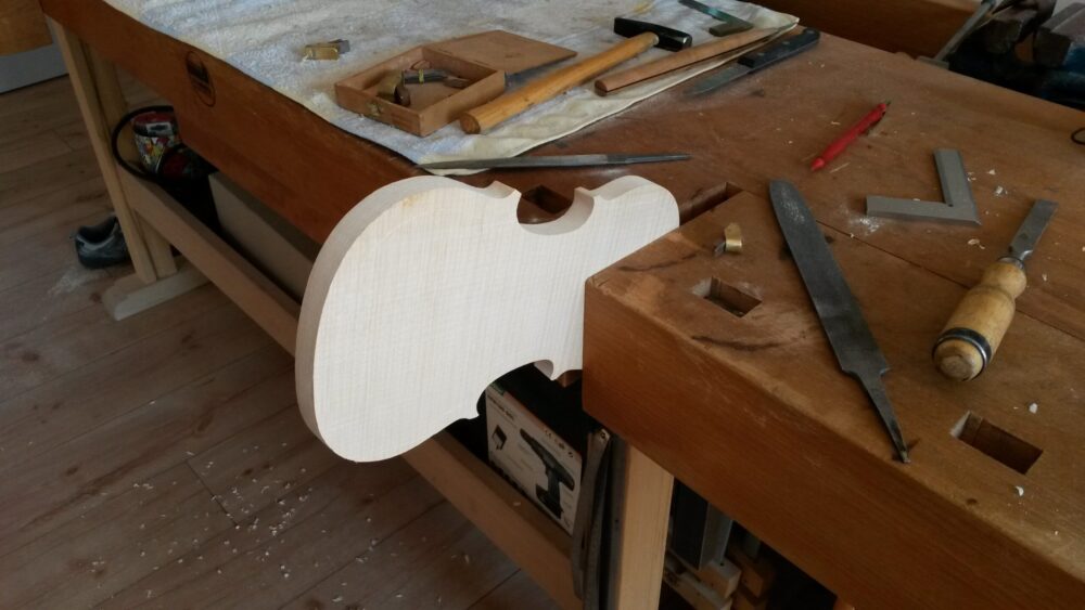 Neubau einer MOHR KindergeigeUtaAdminGeigen262026-04-01T15:09:18+02:00 NeubauNeubau einer MOHR KindergeigeKopie auf Ahornholz aufklebenUmriss aussägen und feilenZargenkranz aufbauen ohne FormbrettBodenplatte bearbeitenBodenplatte außen glättenBodenplatte innen fertigKorpus zusammenleimenKorpus bekommt IntarsieIntarsie reinklopfenSchnecke aussägenSchneckenhals grob behauenGeige zusammengebautLackierungZur Übersicht